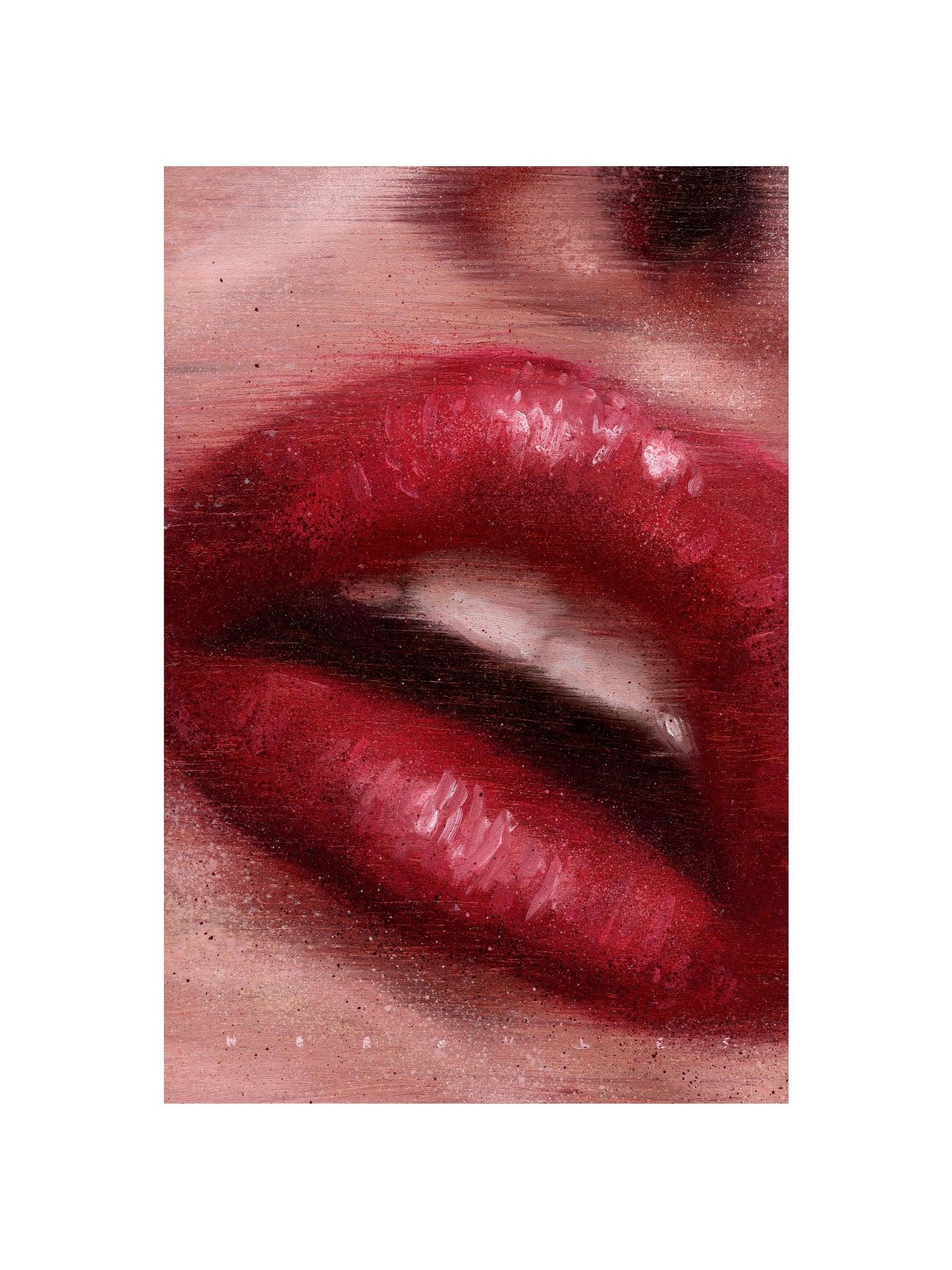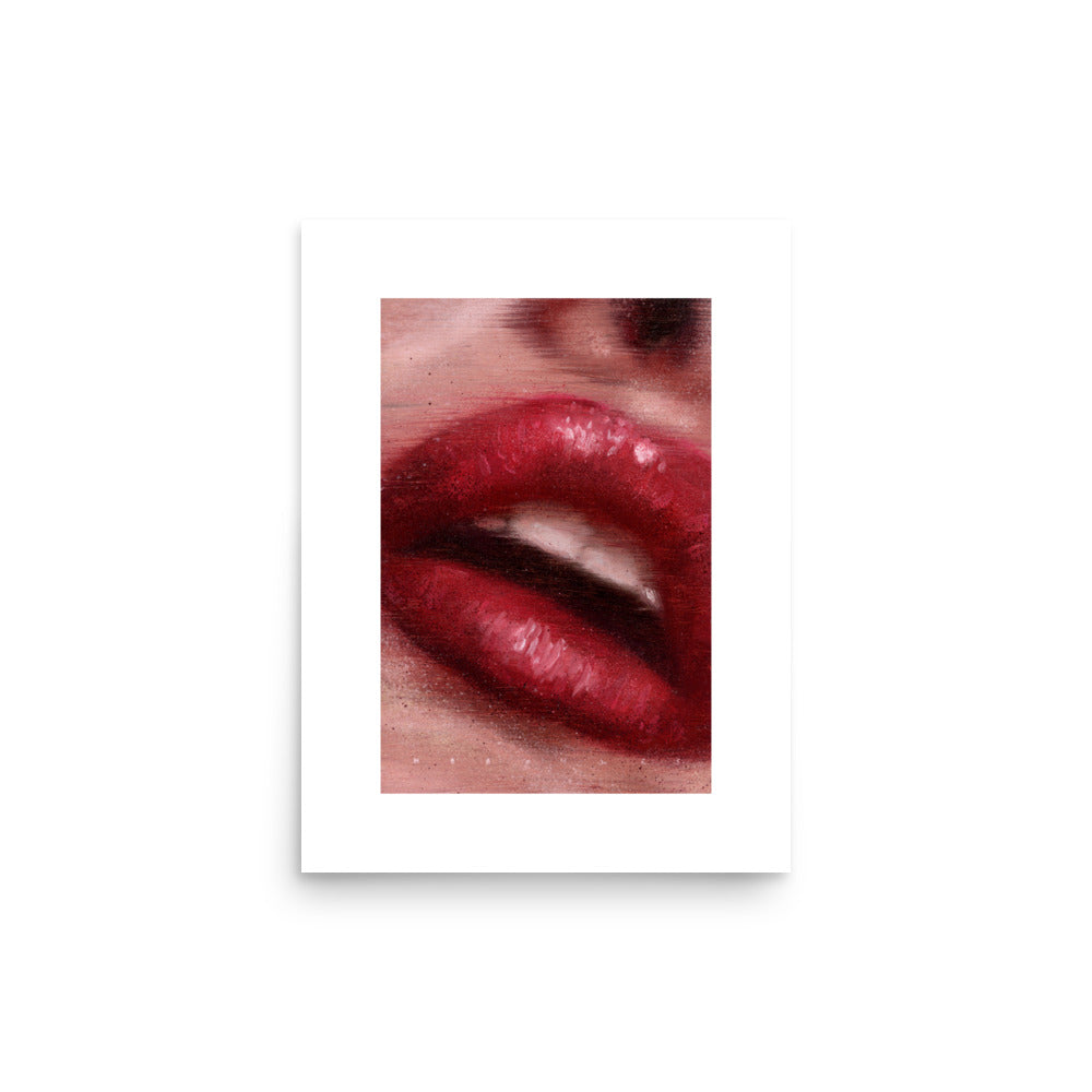 Crimson Lips is a 12"x16" poster reproduction of an original oil painting by Hercules, part of the artist’s evocative Feminine Fragments series. The artwork captures the sensual allure of deep red lips in close detail, blending bold realism with expressive brushstrokes. The rich tones and textured finish make it a striking and contemporary piece of wall art.