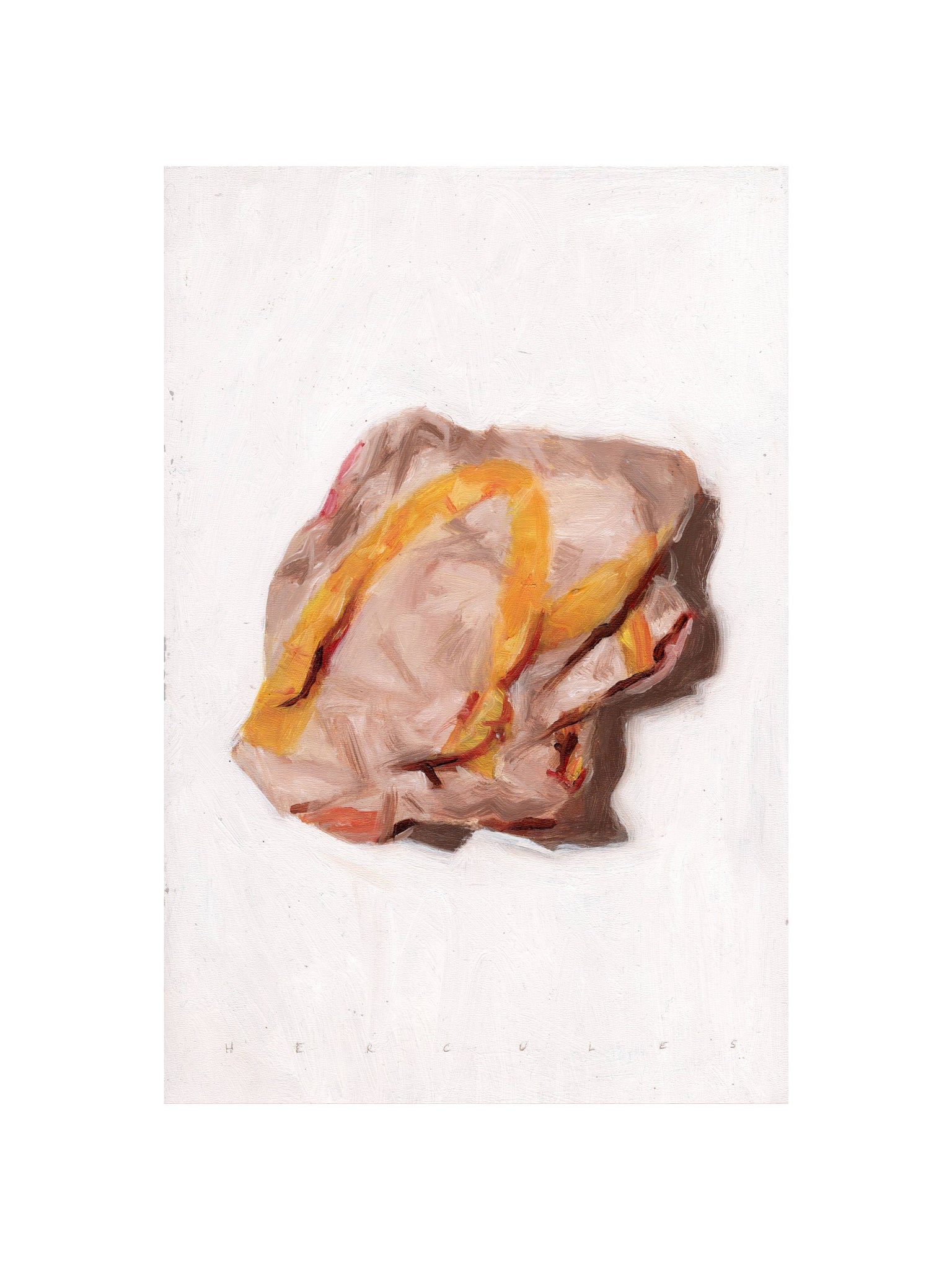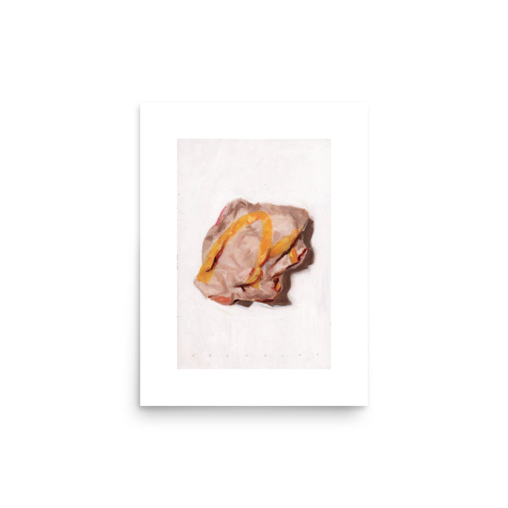 Celebrate modern aesthetics with Golden Wrinkle, a 12"x16" oil painting print by contemporary artist Hercules. This unique still life captures the folds and textures of a crumpled paper bag with the iconic golden arches, transforming an everyday object into a striking work of art. The expressive brushstrokes highlight form, imperfection, and beauty in the ordinary.