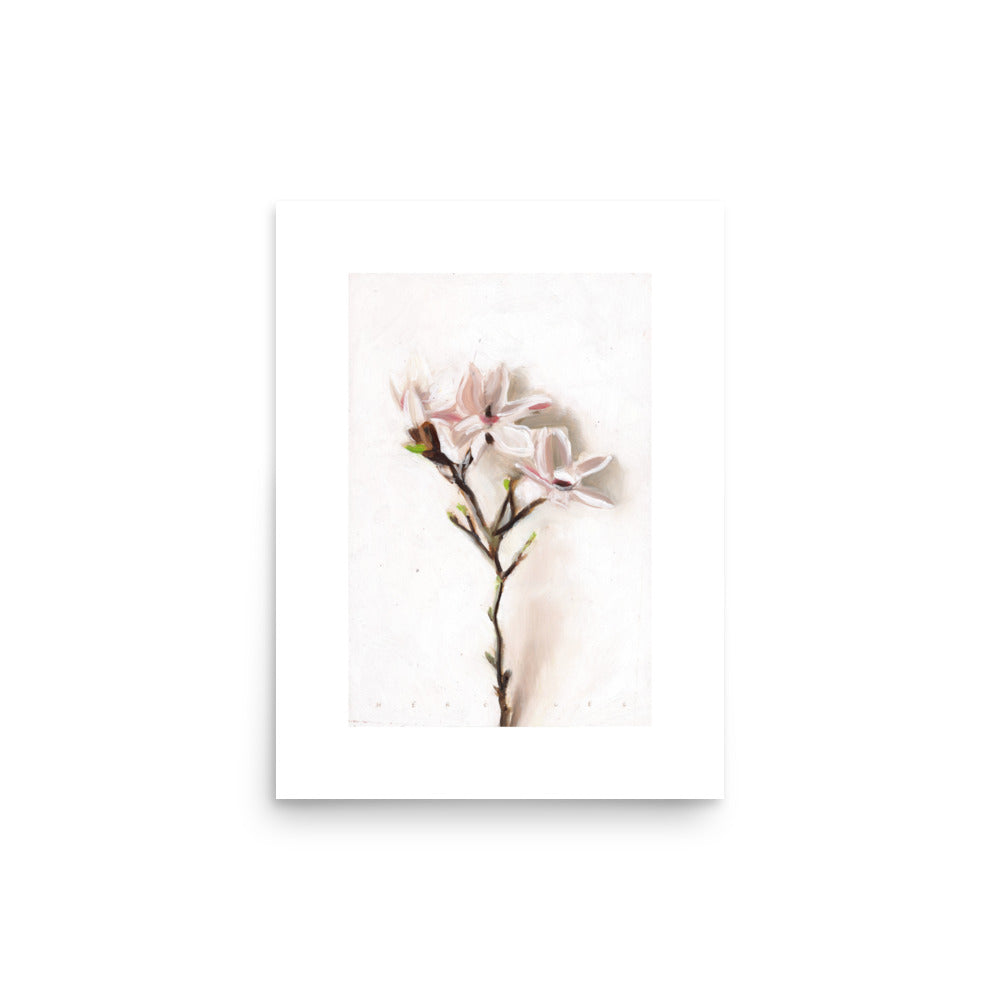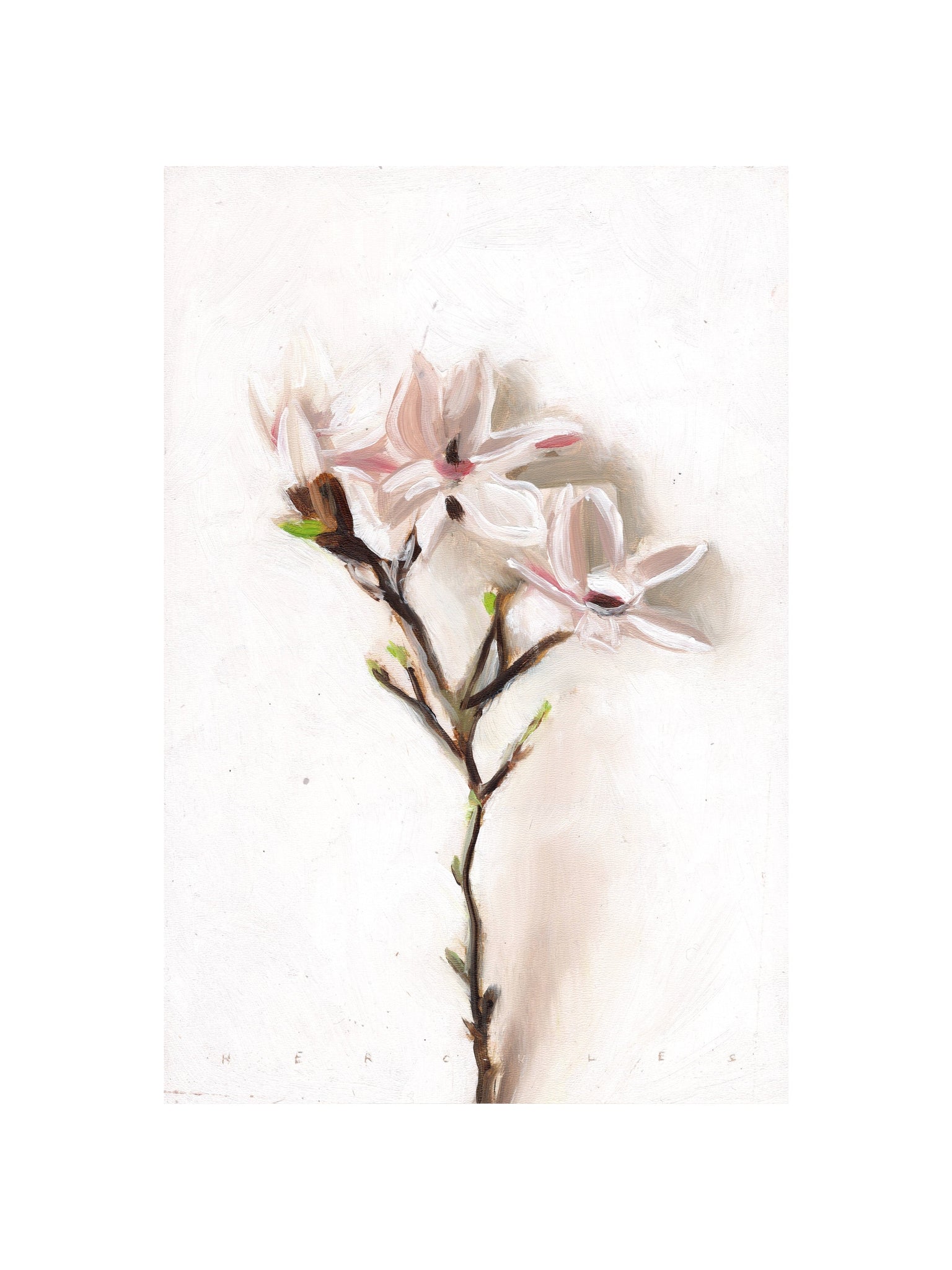 Celebrate elegance and renewal with Magnolia Grace, a 12"x16" poster of an original oil painting by contemporary artist Hercules. This delicate artwork captures magnolia blossoms in soft whites and blush tones, symbolizing purity, femininity, and strength. The minimal background highlights the fragile beauty of the petals, making it an aesthetic piece for modern interiors.