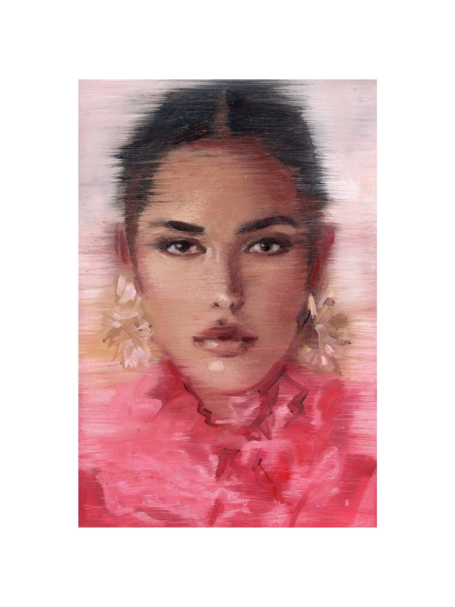 Radiant Elegance is a 12"x16" poster reproduction of an original oil painting by contemporary artist Hercules. This artwork captures the serene yet powerful beauty of a woman in vibrant pink attire, adorned with delicate statement earrings. The soft brushstrokes and blurred textures highlight both strength and vulnerability, reflecting the essence of modern femininity.
