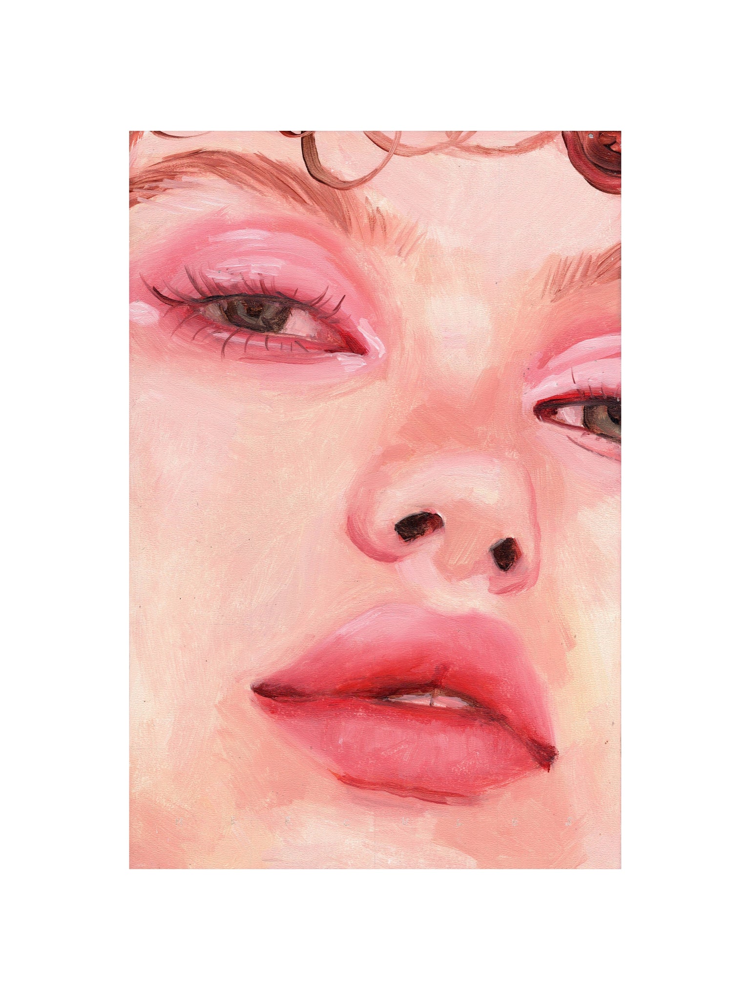 Immerse yourself in the beauty of Rose Glance, a 12"x16" oil painting print by contemporary artist Hercules. This captivating portrait close-up highlights soft pink tones in the eyes, cheeks, and lips, painted with expressive brushstrokes that balance tenderness and strength.