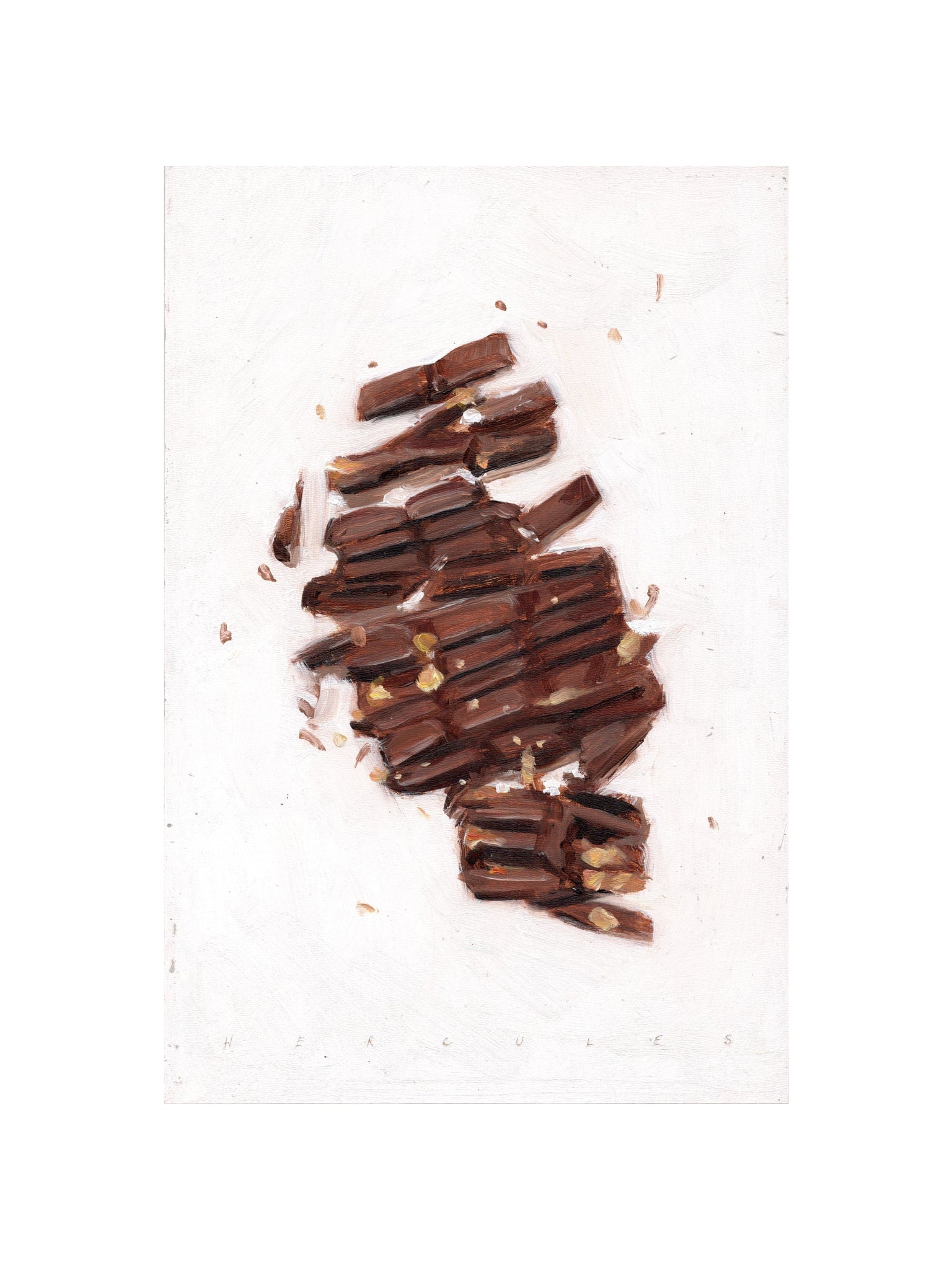 Indulge in the rich textures of Sweet Break, a 12"x16" oil painting print by contemporary artist Hercules. This artwork captures a scattered stack of dark chocolate pieces with golden nut accents, painted in expressive brushstrokes against a clean white background. The minimal yet bold composition celebrates the beauty of simple pleasures.