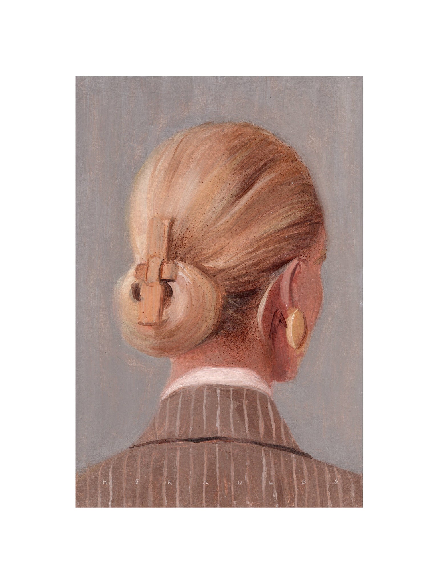 Discover quiet elegance with The Bun, a 12"x16" oil painting print by contemporary artist Hercules. This refined portrait shows the back of a woman with her blonde hair neatly tied into a bun and secured with a clip, paired with golden earrings and a striped suit. The piece captures sophistication and subtle strength through detail and texture.