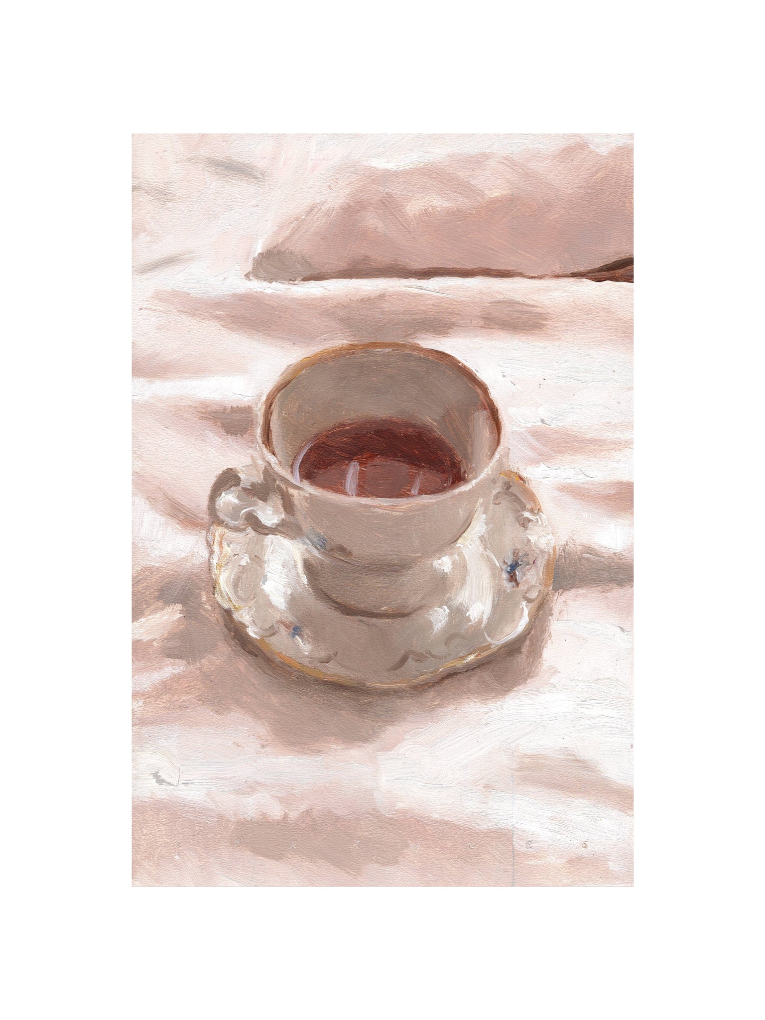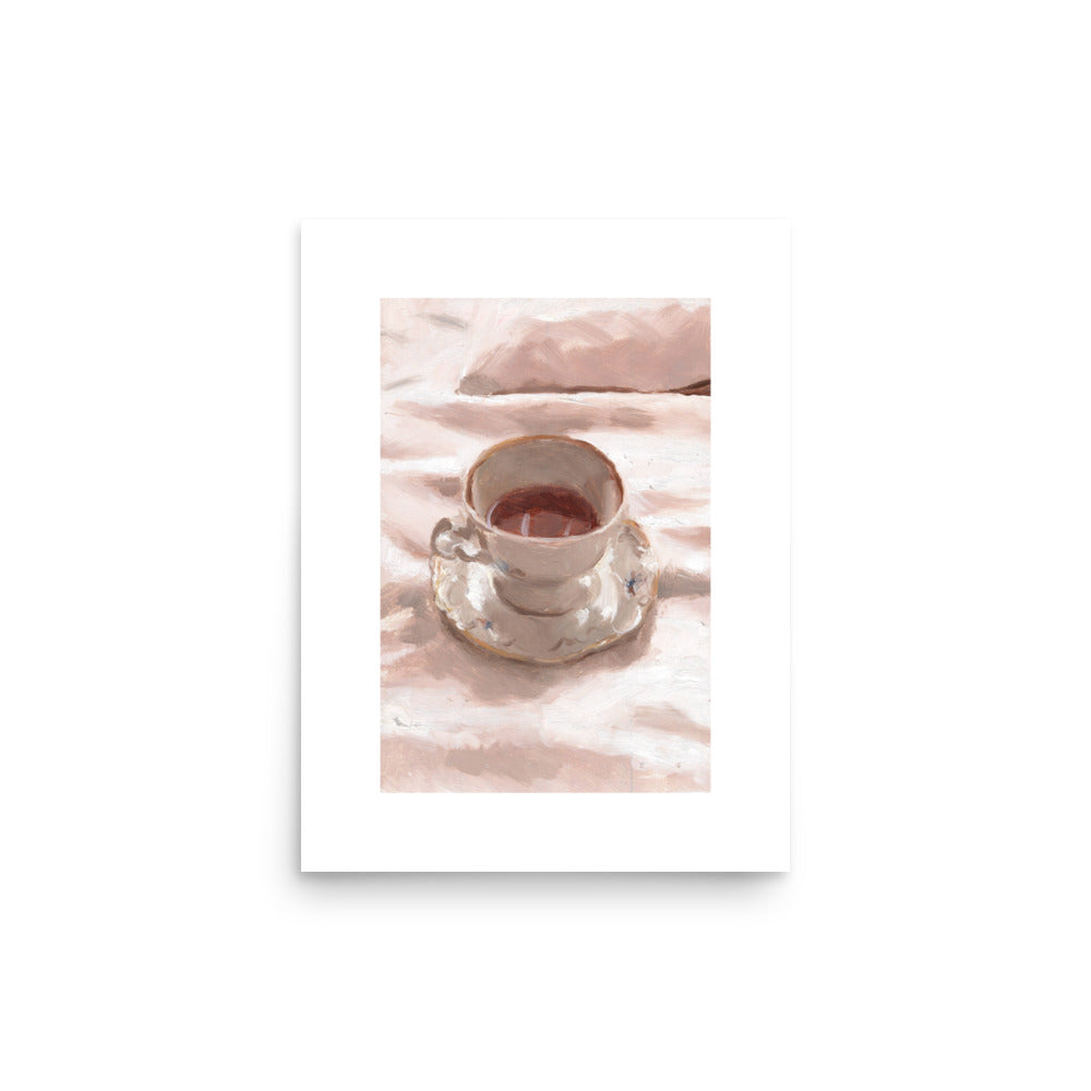 Vintage Teacup Serenity is a 12"x16" poster reproduction of an original oil painting by contemporary artist Hercules. This artwork captures a delicate porcelain teacup resting on soft folds of fabric, radiating calm, femininity, and quiet elegance. With gentle brushstrokes and warm tones, it reflects the timeless rituals of self-care and beauty in everyday moments.
