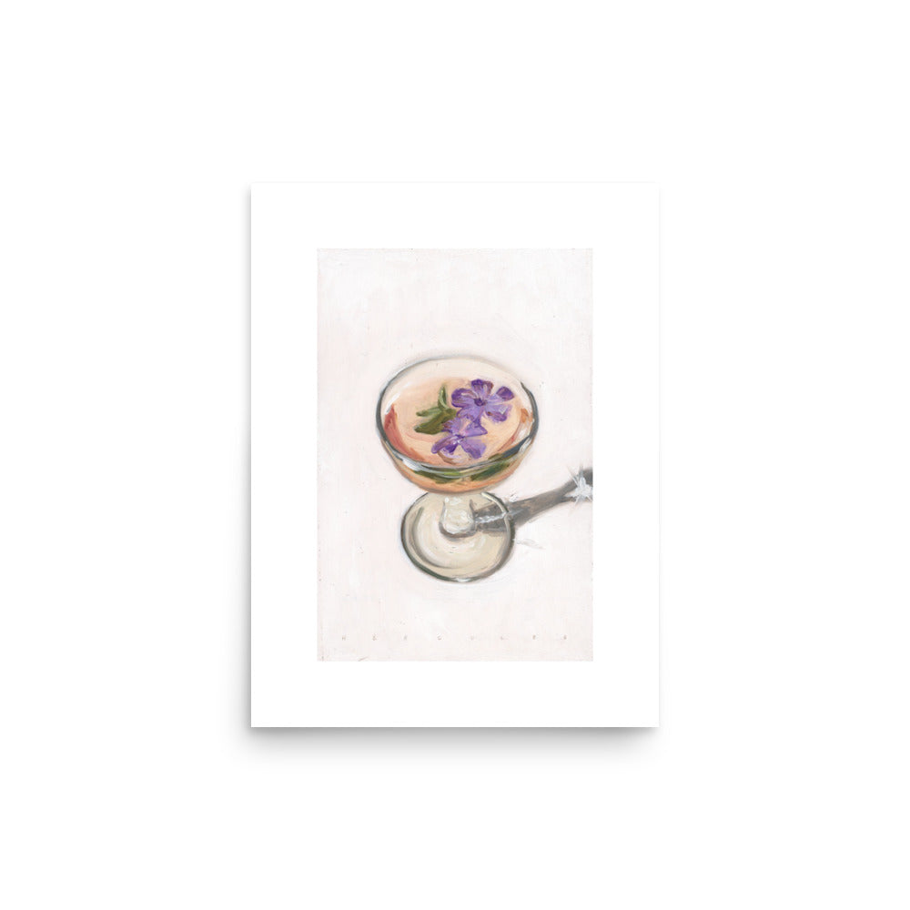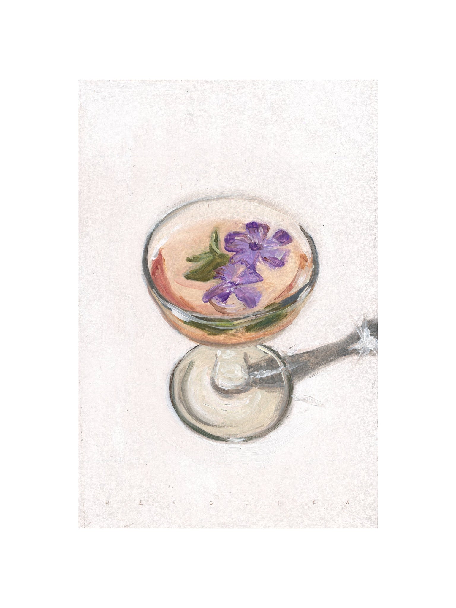 Elevate your interior with Violet Cocktail, a 12"x16" oil painting print by contemporary artist Hercules. This refined still life captures a delicate cocktail garnished with violet flowers, painted with expressive brushstrokes that highlight elegance, femininity, and celebration. The composition blends modern minimalism with timeless charm, making it a standout piece for aesthetic interiors.